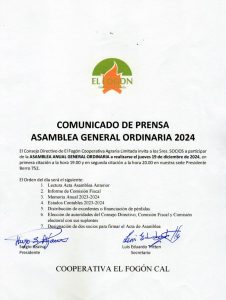 COMUNICADO DE PRENSA El Consejo Directivo de El Fogón Cooperativa Agraria Limitada invita a los Sres. SOCIOS a participar de la ASAMBLEA ANUAL GENERAL ORDINARIA a realizarse el miércoles 20